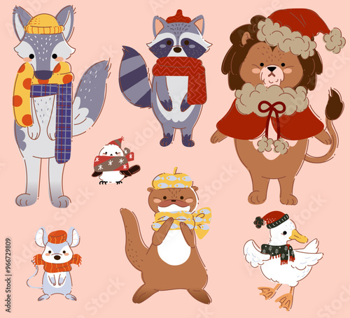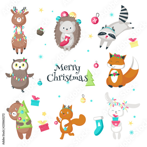 Набор осенних значков с милыми животными и надписью "Привет, осень". Векторная иллюстрация олененка лисы совы кролика енота ежа медведя белки с зонтиком, листьями и т.д., изолированных на белом фоне.
