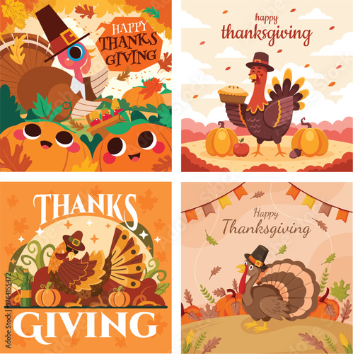 Осеннее настроение. Векторный набор рисованных иллюстраций. Плакаты осеннего сезона, птица Снегирь на дереве, природа осеннего пейзажа с рекой и лесом.