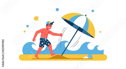 Вектор погоды с осенним дождем. Иллюстрация людей в дождевиках, идущих по улице под зонтиком. Холодные дождливые штормовые и ветреные сезонные условия окружающей среды