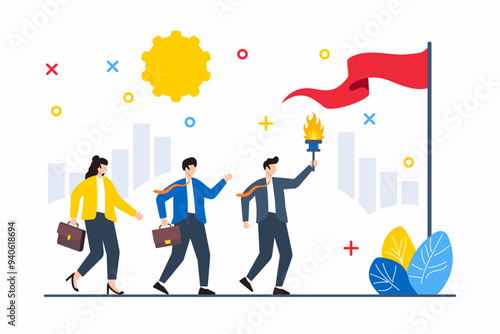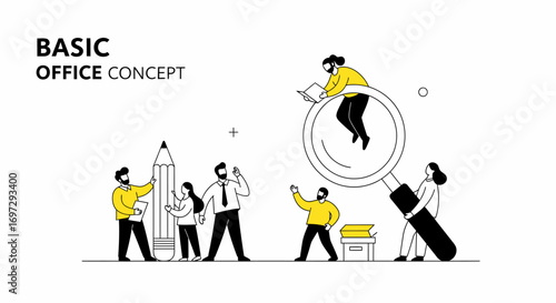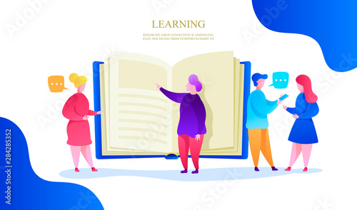 Огромная книга, падающие желтые кленовые листья и микро-мужские и женские персонажи, идущие по улице с зонтиком, векторная иллюстрация. Композиция осеннего сезона для веб-баннера, страницы сайта и т.д.