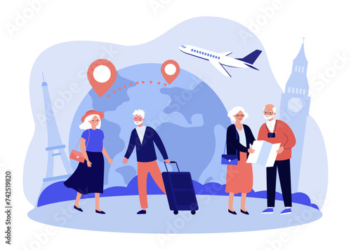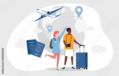 Избегайте поездок, чтобы остановить глобальную пандемию коронавируса, векторная плоская иллюстрация. Мир сталкивается с пандемией нового коронавируса covid-19. Туристы, стоящие по всему земному шару с закрытыми границами стран