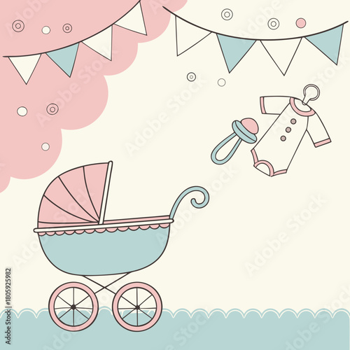 Детская коляска, векторная детская коляска, мультяшный значок детской коляски. Коляска-тележка для новорожденного ребенка, изолированная на белом фоне