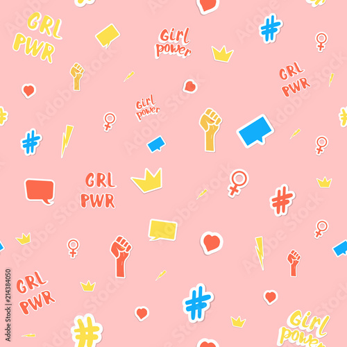 Векторный бесшовный узор с милыми кроликами, детскими игрушками, пинетками для новорожденных девочек. Фон для душа ребенка, обои, ткань, оберточная бумага.