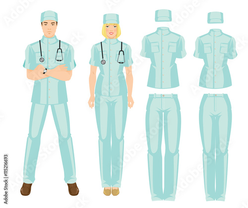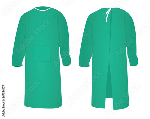 Комплект бактериологического защитного костюма, векторная иллюстрация. Больница, санитарная одежда для персонала скорой медицинской помощи. Зеленый защитный костюм. Скраб для ухода за больными, шапочка, маска, футболка для ухода за больными, обувь, защитные очки, перчатки.