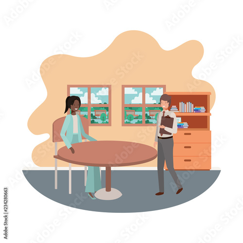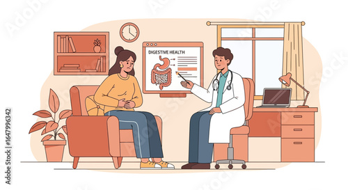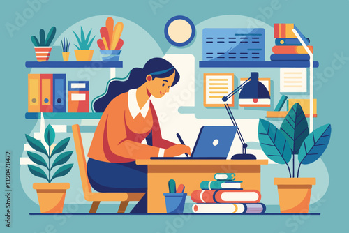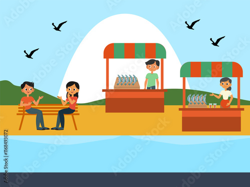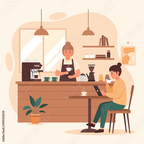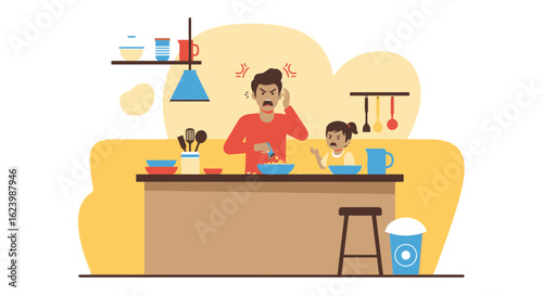 Пекарь замешивает тесто скалкой, выпекает хлеб в дровяной печи пекарни, векторная плоская иллюстрация. Интерьер пекарни, свежеиспеченные французские багеты, круассаны на полках, шеф-повар готовит хлеб.