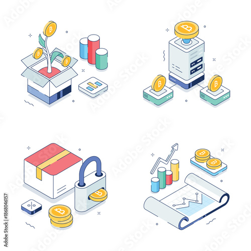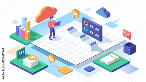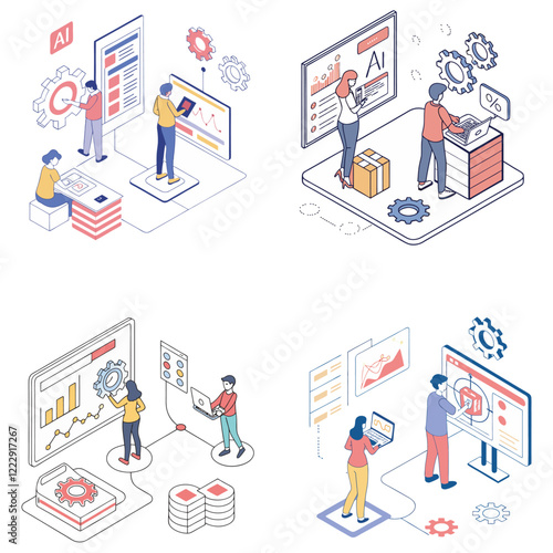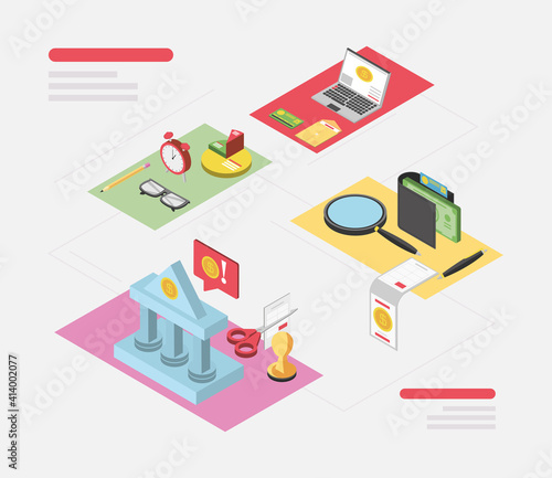 Обработка банковского кредита изометрическая блок-схема, инфографика, плоская векторная иллюстрация. Система оценки кредитоспособности, символы личного кредитного рейтинга, встреча мультяшных персонажей кредитора и клиента.