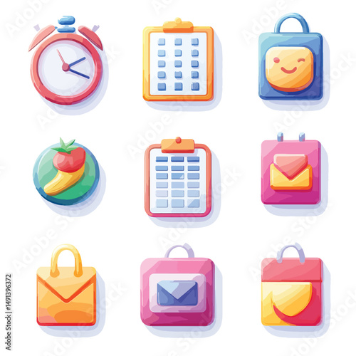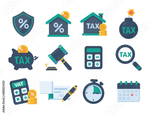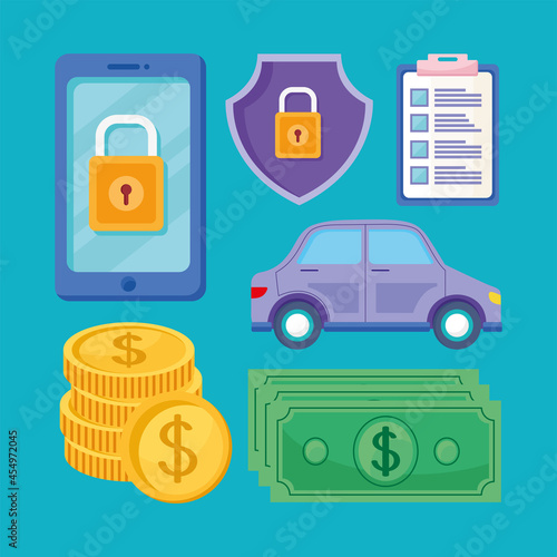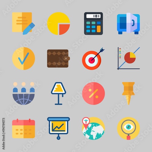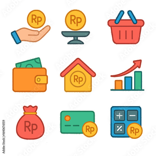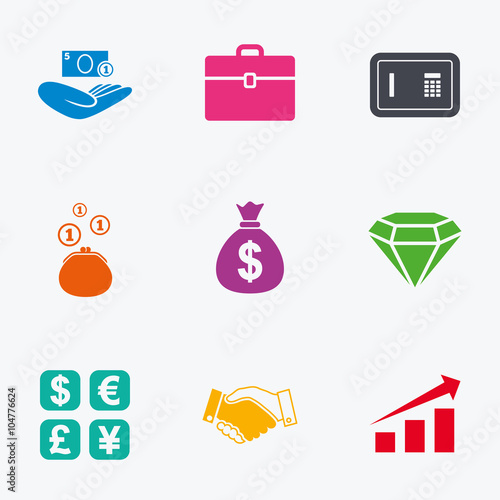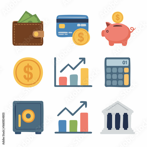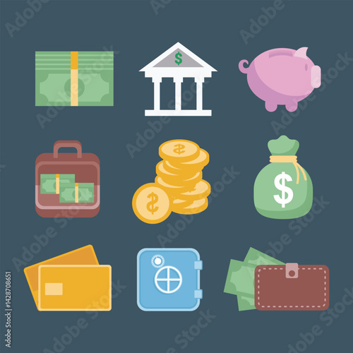 Набор значков банка, денег и финансового бизнеса. Векторная монета, кредитная карта, кошелек, валюта для знака оплаты. Финансовый обмен, наличные деньги, здание, портфель и калькулятор изолированная иллюстрация