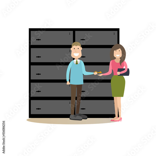 Векторная иллюстрация банковского служащего мужского пола, дающего ключ от сейфа женщине-клиенту. Элементы дизайна в плоском стиле концепции Bank people, значки, выделенные на белом фоне.