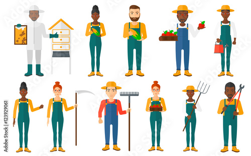 Векторная иллюстрация банковского кассира, менеджеров и клиентов, вооруженных инкассаторов и охранника. Символы банковских служащих, значки, выделенные на белом фоне. Дизайн в плоском стиле.