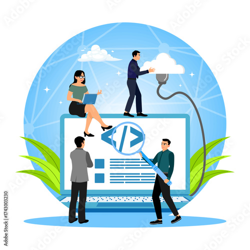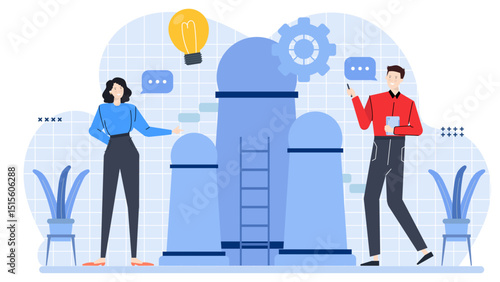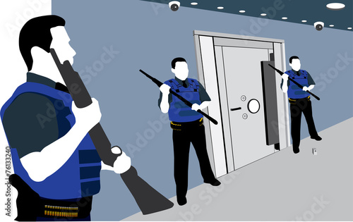 Векторная иллюстрация двух бизнесменов, открывающих дверь банковского хранилища. Электрические лампочки в сейфе.
