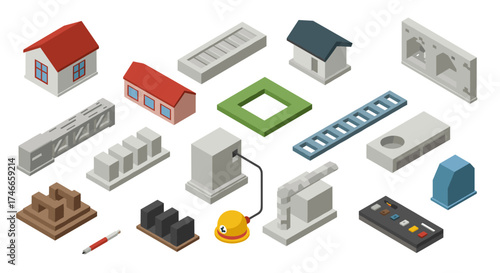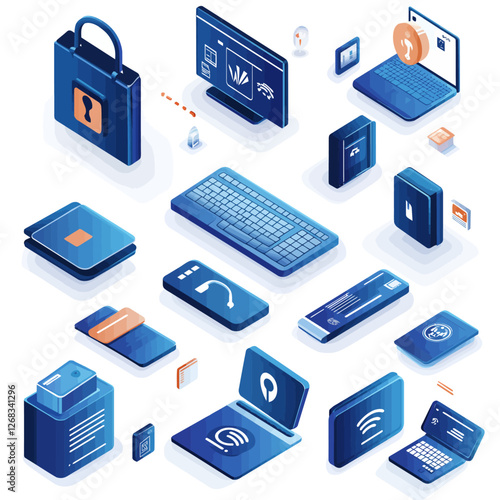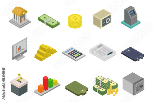 Набор банковских и финансовых значков, векторная изометрическая иллюстрация, изолированная на белом фоне. Здание банка, знак доллара, сейф, кредитная карта, копилка, pos-терминал, схема калькулятора защитного замка и т.д.