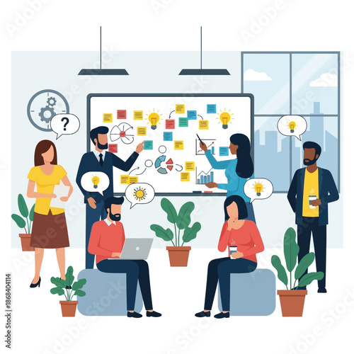 Векторная иллюстрация сотрудников банка, вооруженных инкассаторов, охранника и клиентов, стоящих в очереди к кассе и банкомату. Банковские служащие, значки, выделенные на белом фоне. Элементы дизайна в плоском стиле.