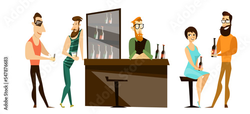Посетители бара за стойкой регистрации векторная иллюстрация. Пара мужчин и женщин, друзья мужского пола пьют алкоголь, в то время как бармен обслуживает клиентов, взбивая коктейли. Люди отдыхают после работы, назначают свидания и веселятся