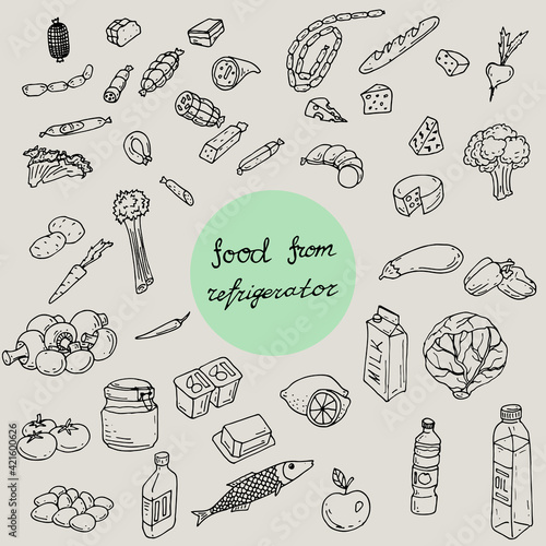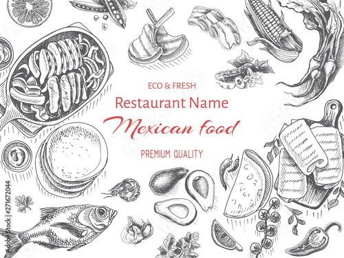 Винтажный шаблон дизайна плаката для барбекю. Векторная реалистичная тарелка с видом сверху с ножом и вилкой и нарисованной чернилами от руки едой для барбекю, мясом, специями, травами.