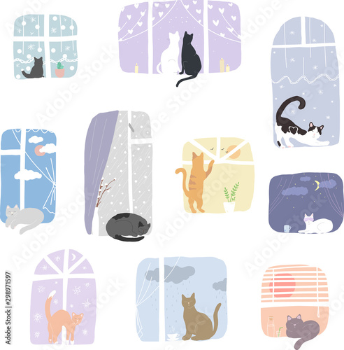 Парикмахер подстригает волосы клиента в парикмахерской, набор векторных плакатов. Дизайн интерьера парикмахерской со стульями, зеркалами. Парикмахер, стилист стрижет волосы, делает мужские прически. Аксессуары для парикмахерской.