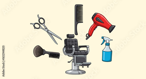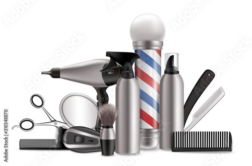Парикмахерское оборудование, векторная иллюстрация. Реалистичные инструменты парикмахера зеркало, ножницы, расческа, фен, машинка для стрижки волос, кисточка для бритья, пена для бритья, парикмахерский столб и другие аксессуары для стрижки и ухода за бородой.