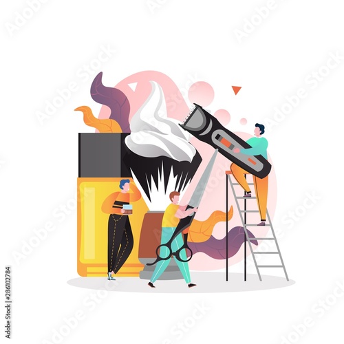 Векторная иллюстрация крошечных персонажей с большими парикмахерскими принадлежностями для ухода за бородой, бритвенный станок, лосьон после бритья, кисточка для бритья с пеной, ножницы. Концепция парикмахерской для веб-баннера и т.д.