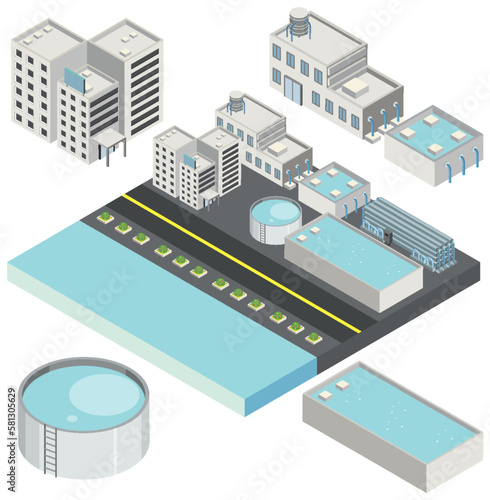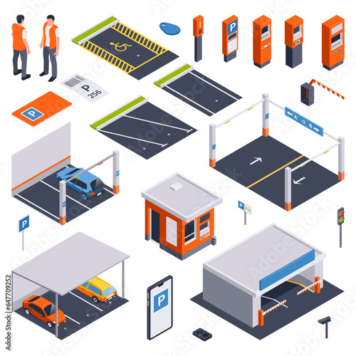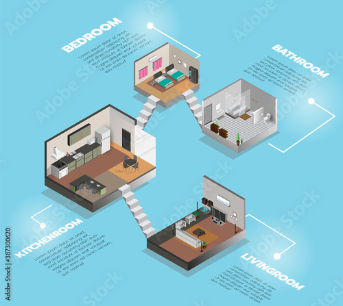 Конструктор интерьера ванной комнаты, векторная плоская изолированная иллюстрация. Ванные комнаты с изометрическим вырезом и мебелью ванна, душевая кабина, зеркало, туалет, умывальник, вешалка для полотенец и шкаф для ванной комнаты.