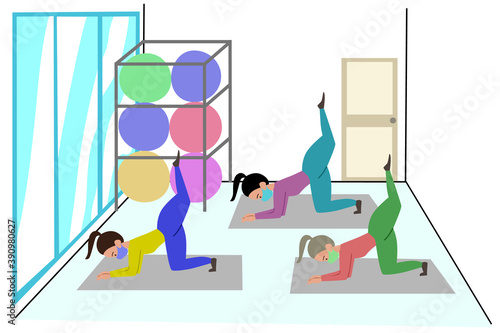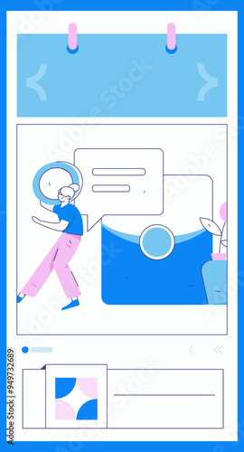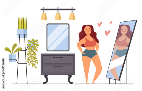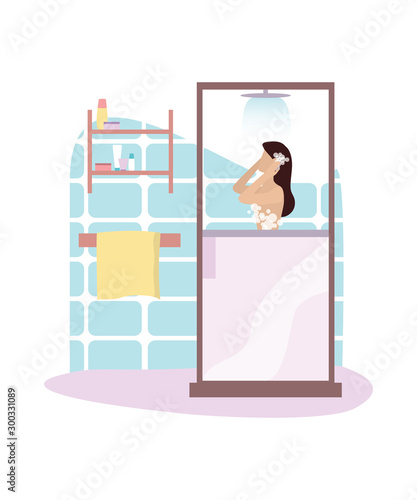 Интерьер ванной комнаты и девушка, принимающая душ, векторная плоская иллюстрация. Современная душевая кабина, умывальник, зеркало и светильники. Интерьер женской ванной комнаты.