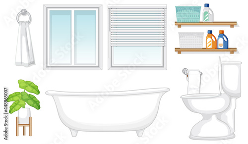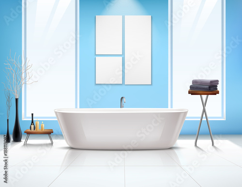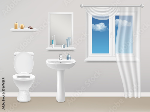 Векторная реалистичная иллюстрация интерьера ванной комнаты с белым пластиковым закрытым окном с белой занавеской, умывальником, туалетом, зеркалом и туалетными принадлежностями.