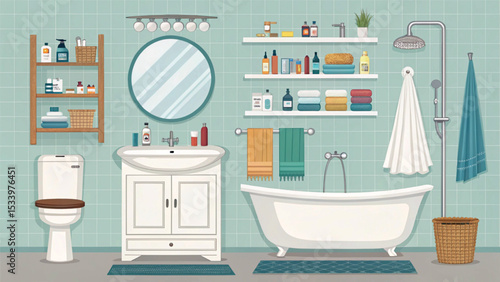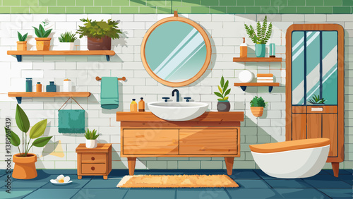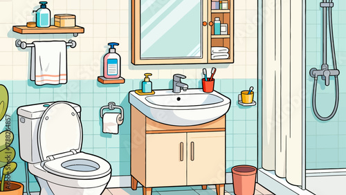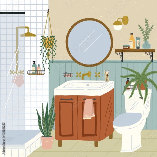 Интерьер ванной комнаты с душевой кабиной, туалетом и умывальником. Рисованная векторная иллюстрация в уютном скандинавском стиле. Дизайн интерьера дома.