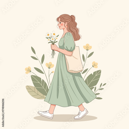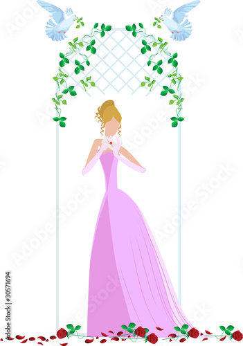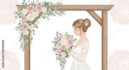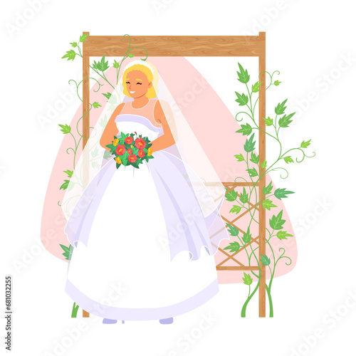 Красивая невеста у цветочной арки наслаждается векторной иллюстрацией фотосета свадебной церемонии. Празднование свадебной вечеринки в элегантном саду