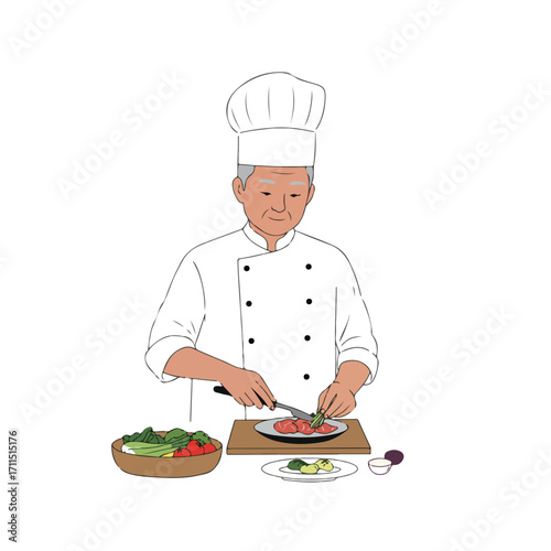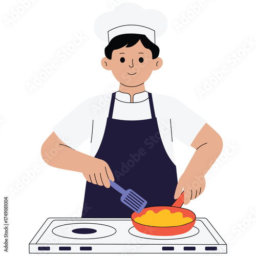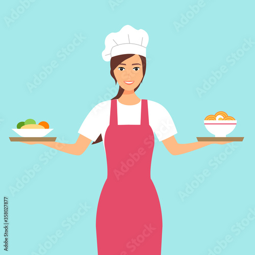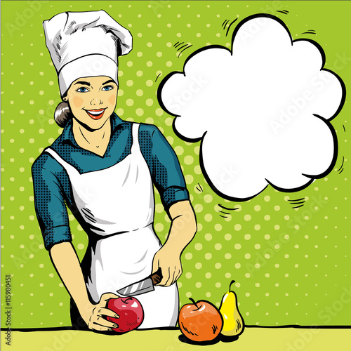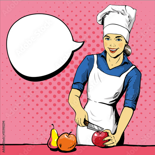 Красивая женщина готовит. Векторная иллюстрация в стиле ретро поп-арт. Женщина-повар в униформе. Концепция ресторана.