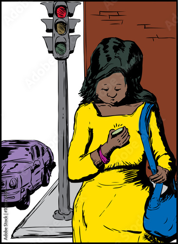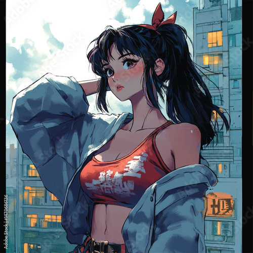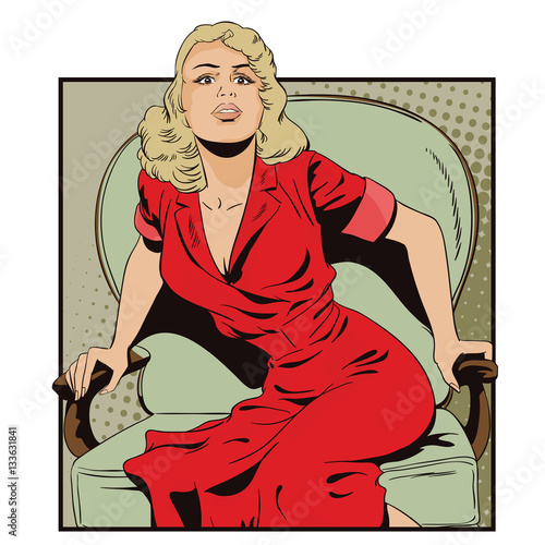 Красивая женщина сидит на сумке в аэропорту. Векторная иллюстрация в стиле комического ретро-поп-арта.
