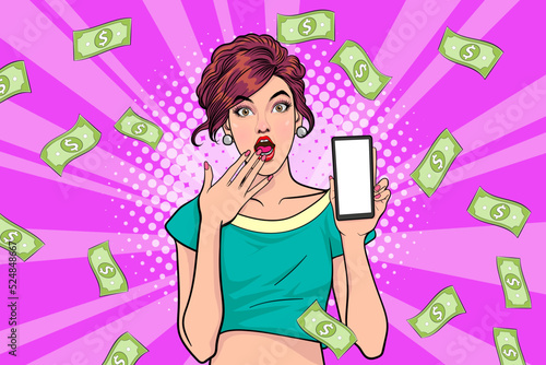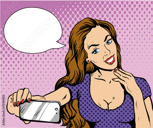 Красивая женщина делает селфи со своим смартфоном. Векторная иллюстрация в стиле ретро-комиксов поп-арт. Девушка с речевым пузырем.
