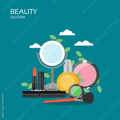 Векторная иллюстрация дизайна салона красоты в плоском стиле. Зеркала, тушь для ресниц, губная помада, кисточка для румян, распылитель, тени для век. Концепция услуг салона красоты, студии макияжа для веб-баннера, страницы веб-сайта и т.Д