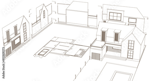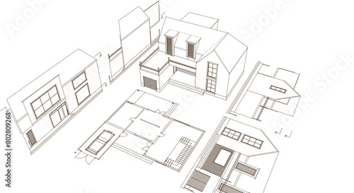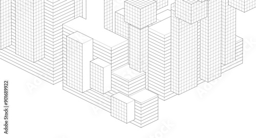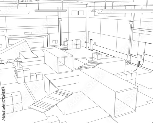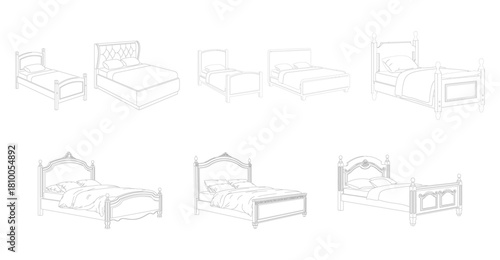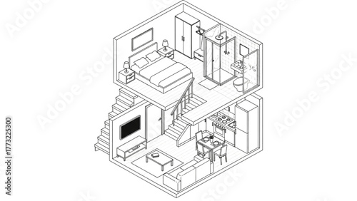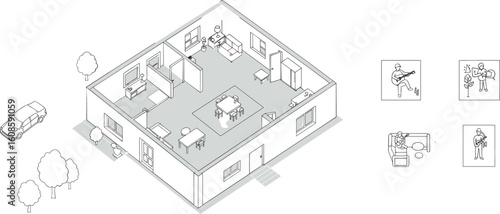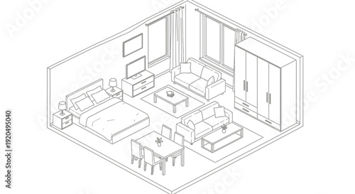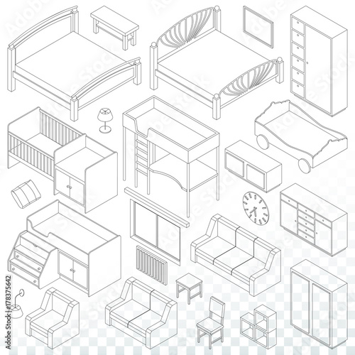 Создатель интерьера спальни. Векторная изометрическая вырезанная пустая комната с современной мебелью в линейном стиле. Конструктор для спальни.