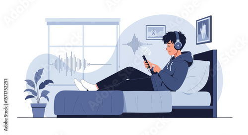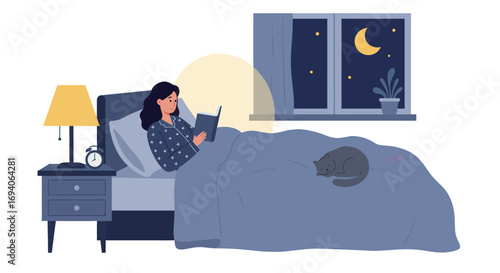 Векторная иллюстрация молодой пары, отдыхающей в постели. Домашний интерьер спальни. Дизайн в плоском стиле.