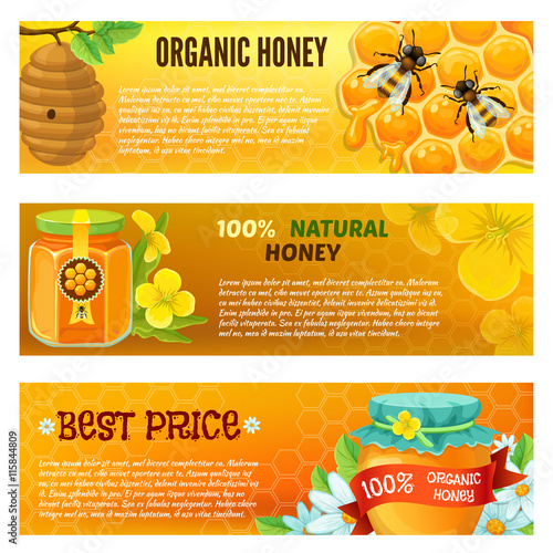 Векторный плакат с натуральным пчелиным медом, листовка, набор баннеров. Элементы дизайна концепции натурального органического продукта honey, нарисованные вручную, для рекламы медового бизнеса.