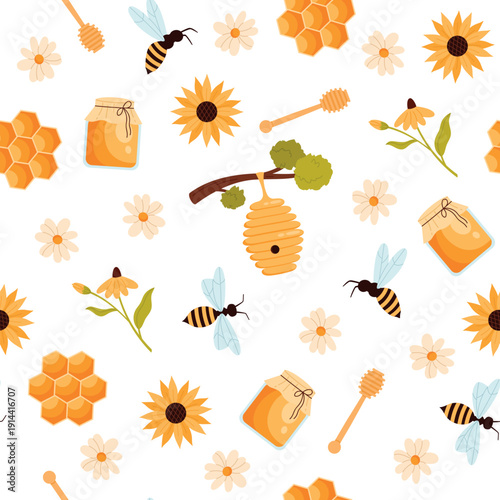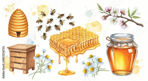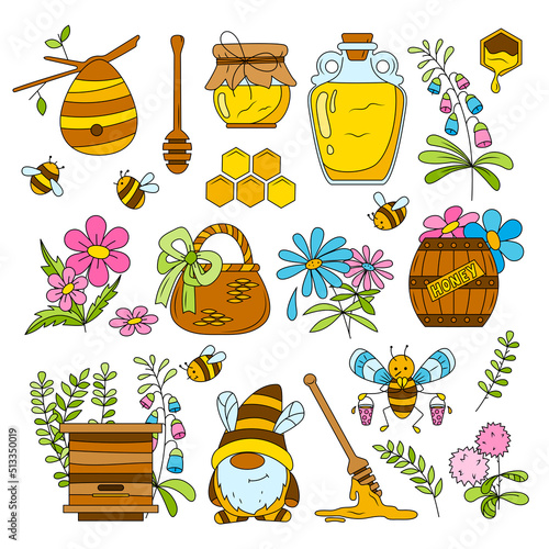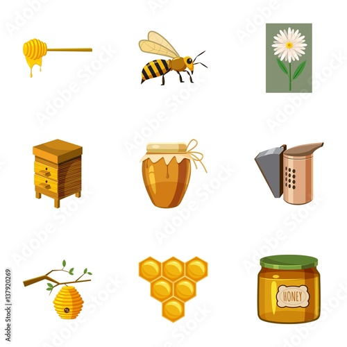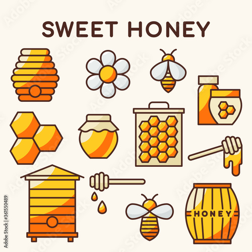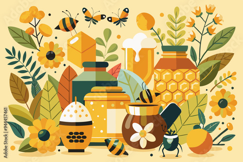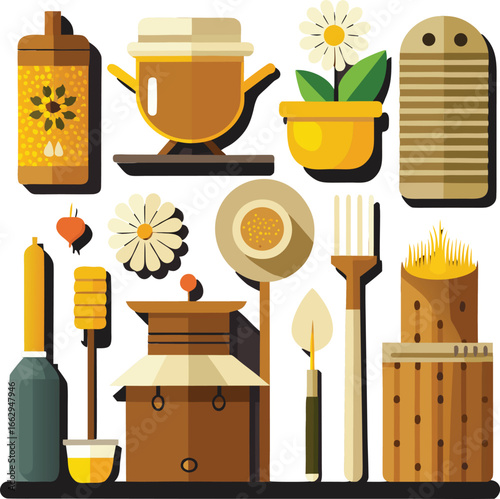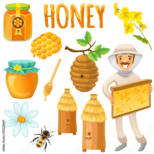 Набор для пчеловодства, плоская векторная иллюстрация. Персонажи мультфильма "Пчеловод", улей, пчела, соты, банка с медом, ковшик, бочкообразные цветы. Полезный сладкий сироп. Пчеловодческая ферма. Бизнес по разведению медоносных пчел.