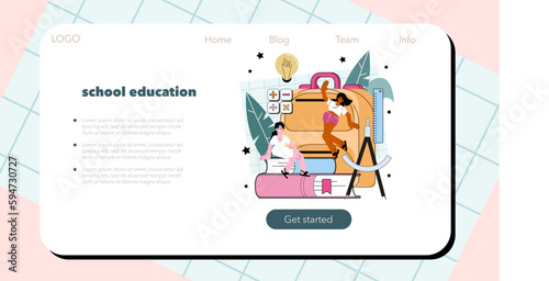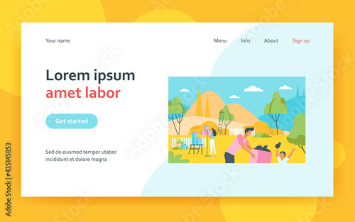 Лучший векторный шаблон веб-сайта для семейного путешествия, дизайн веб-страницы и целевой страницы для разработки веб-сайтов и мобильных сайтов. Семья с двумя детьми и собакой путешествует на машине. Концепция летних каникул.