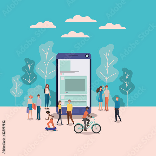 Система обмена велосипедами с персонажами, платежный терминал, векторная плоская иллюстрация. Женщина разблокирует велосипед с помощью смартфона. Общественный сервис обмена велосипедами и проката, концепция мобильного приложения для обмена велосипедами.