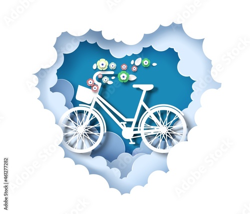 Велосипед с цветочной корзиной внутри слоистой бумаги, вырезанной из облаков в форме сердца, векторная иллюстрация. Обожаю велосипед. Шаблон открытки на День Святого Валентина.