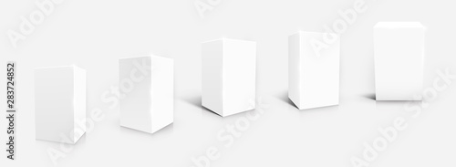 Белая картонная упаковочная коробка с прозрачным пластиковым окном, пустой 3d-макет векторного дизайна. Большой шаблон бумажной упаковки разной формы изолированный набор