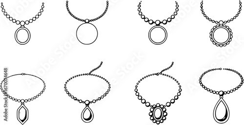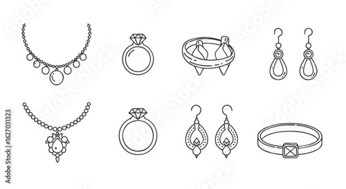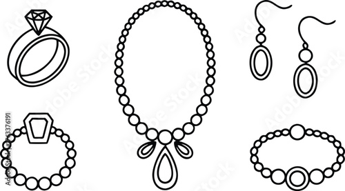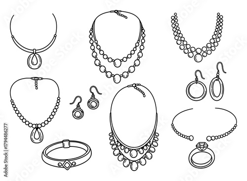 Набор бижутерии векторная иллюстрация, нарисованная вручную чернилами, изолированная на белом фоне. Кольцо, колье, серьги, кулон, браслет из коллекции украшений doodle.