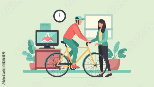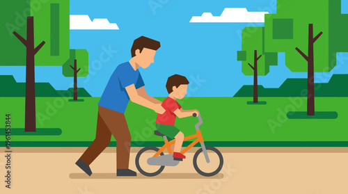Векторная иллюстрация отца, учащего своего сына кататься на велосипеде. Концепция ухода за детьми и воспитания детей элемент дизайна в плоском стиле.