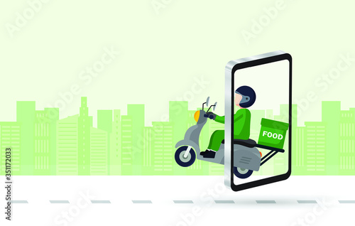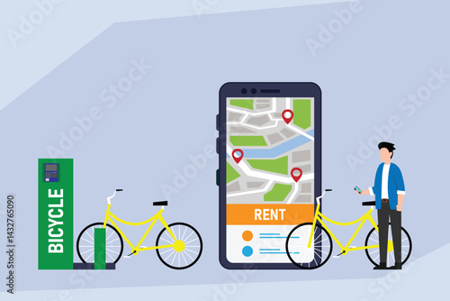 Векторная плоская иллюстрация концепции сервиса проката велосипедов. Человеческая рука держит смартфон с приложением для проката велосипедов, прокат велосипедов на док-станции и платежный терминал на городской улице.