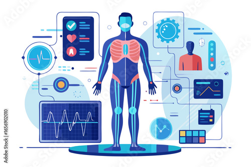 Вектор распознавания лиц. Иллюстрация сканера лица. Система биометрической идентификации для обеспечения безопасного доступа к данным. Иллюстрация человека, использующего технологию аутентификации в мобильном приложении