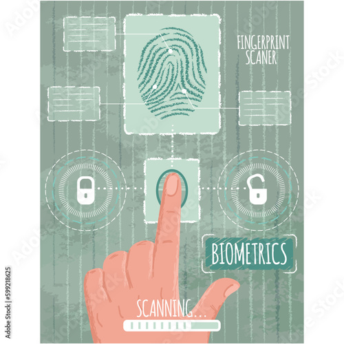 Плакаты с технологией биометрической безопасности. Сканирование отпечатков пальцев, распознавание лиц, баннер системы идентификации. Рисованная векторная иллюстрация. Конфиденциальность, распознавание лиц в толпе людей, безопасный доступ.