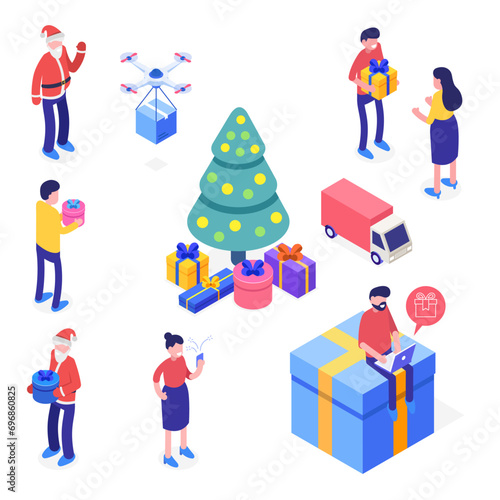 Празднование дня рождения с подарками и тортом, плоская векторная изометрическая иллюстрация. Мальчик получает подарок на день рождения от бизнес-игры "Монополия".