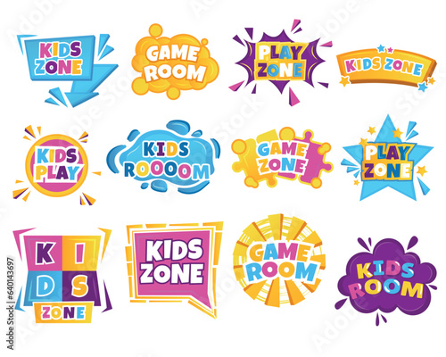 Набор баннеров для детской зоны вечеринки по случаю дня рождения, векторная изолированная иллюстрация. Абстрактные цветные формы, креативная типография с надписями от руки для приглашения на вечеринку, открытки, детской игровой комнаты или логотипа центра.