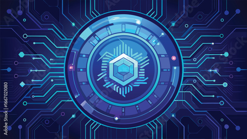 Вектор майнинга биткойн-монет. Футуристический фон криптотехнологий. Иллюстрация криптографии электронных денег. Шаблон блокчейн-баннера