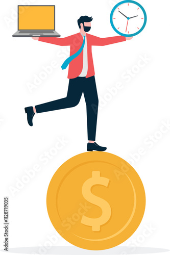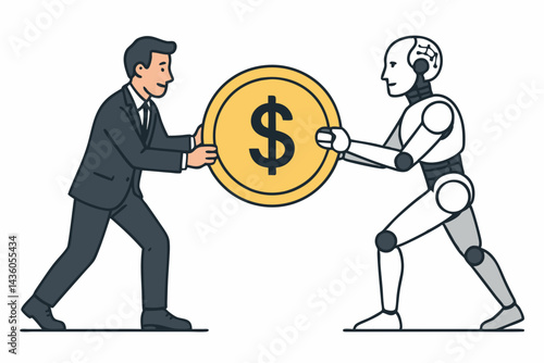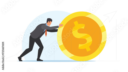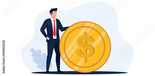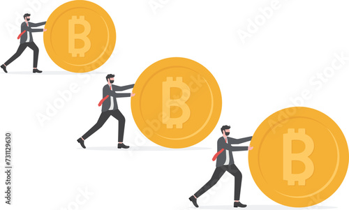 Векторная иллюстрация концепции роста биткоина. Бизнесмены, выпускающие золотые монеты с символами доллара, евро, иены, фунта стерлингов, биткоин опережает другие валюты.