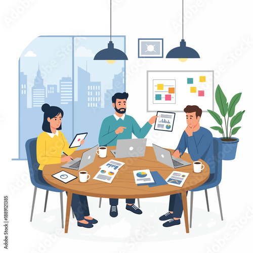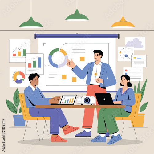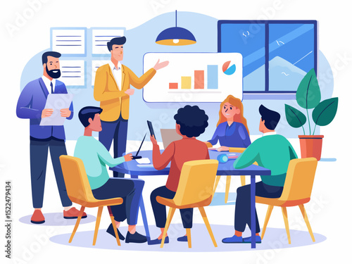 Чернокожий парень представляет финансовые графики для своей бизнес-команды и коллеги. Векторная иллюстрация концепции деловой встречи. Отчет по проекту, корпоративная конференция, обучающий семинар и презентация.