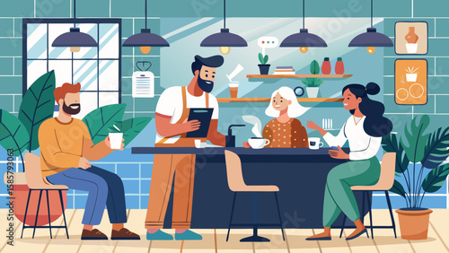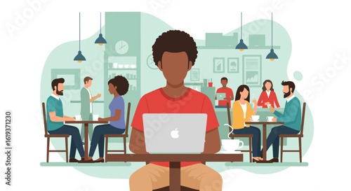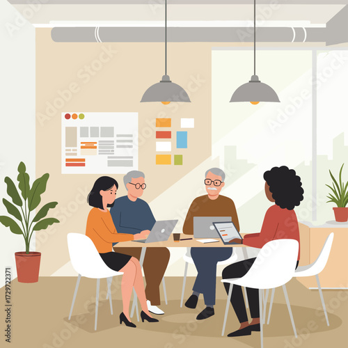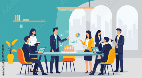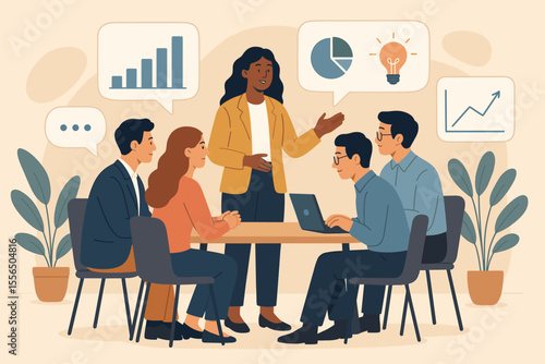 Чернокожий парень представляет финансовые графики для своей бизнес-команды и коллеги. Векторная иллюстрация концепции деловой встречи. Отчет по проекту, корпоративная конференция, обучающий семинар и презентация.