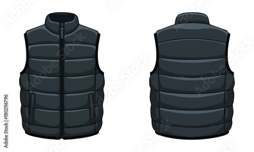 Набор макетов черной пуховой куртки, векторная иллюстрация, изолированная на прозрачном фоне. Реалистичный современный пуховик с капюшоном, стеганое пальто, вид спереди и сзади.